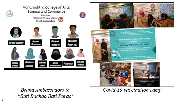 NSS Unit of Maharashtra college of Arts, Science and Commerce has 50 volunteers enthusiastic serving in various fields. Such as Blood camp at churchgate railway station in collaboration Jagjivan Hospital( blood centre), distribution of mask and sanitizers in Kamatipura, Collection of waste in collaboration with Greenway NGO, fund raise for kokan relief, Covid-19 vaccination camp and organized many awareness webinar on various program, our 10 volunteers received Brand Ambassadors in “Bati Bachao Bati Parao” etc.